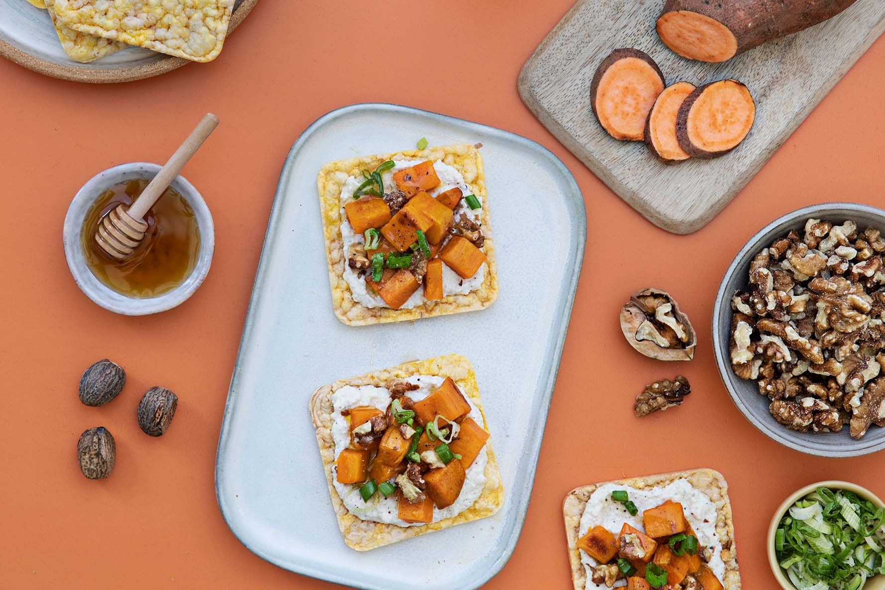 Déposer la crème de tofu soyeux sur les galettes de maïs Bjorg, ajouter les cubes de patates douces, le filet de miel, quelques noix torréfiées et enfin une pincée d’oignon nouveau.