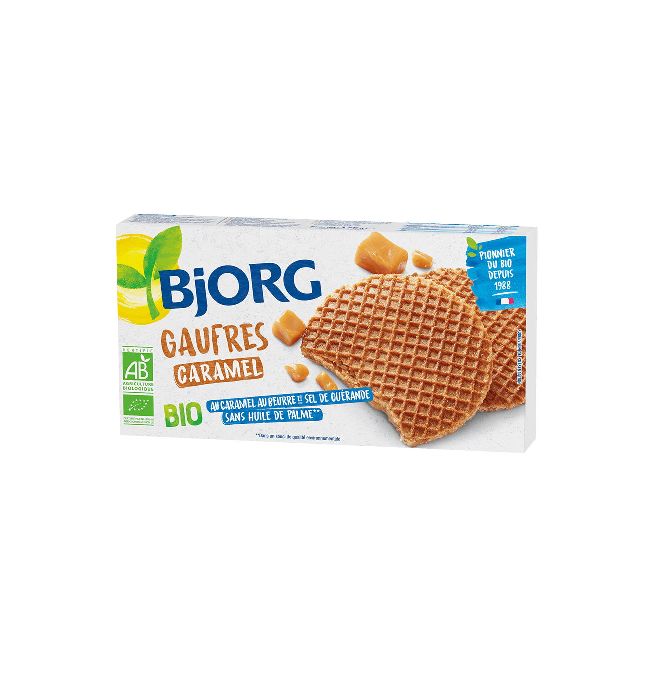 تجمع منتجات الوافل بالكاراميل العضوية بين قوام هشّ وحشو لذيذ بالكاراميل والزبدة وملح غيراند. وتصنع بدقيق نصف كامل.