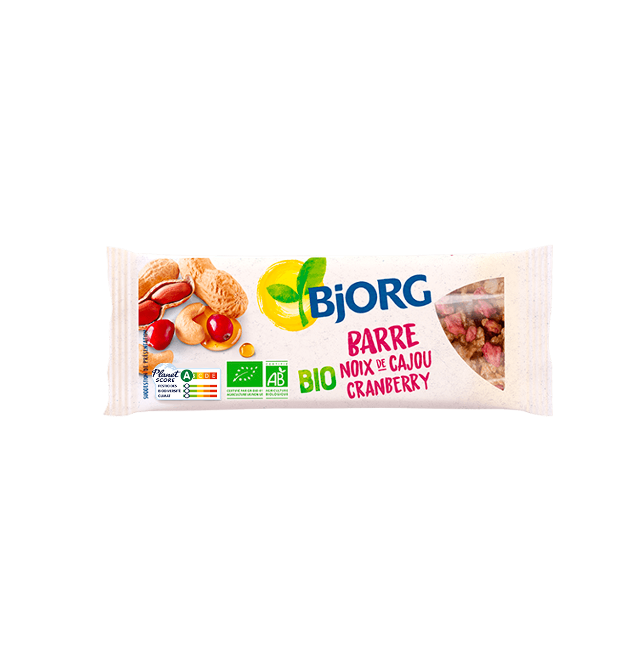 100 % bio, source de fibres et de protéines, cette barre associe la douceur des noix de cajou à l’acidité des cranberries pour une collation saine et énergisante.