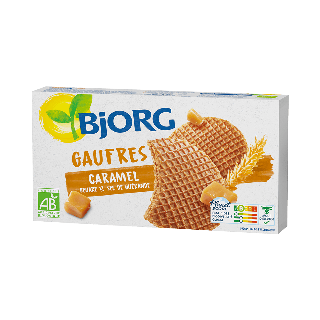 Nos gaufres au caramel biologique allient une texture croustillante à un délicieux fourrage de caramel au beurre et sel de Guérande.