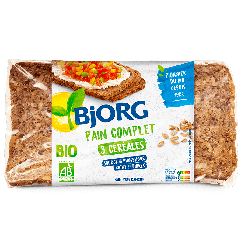Notre Pain complet 3 céréales a été réalisé à partir de farine complète de seigle, de flocons d’avoine et de flocons d’orge. Il est ainsi naturellement riche en fibres, source de magnésium et de phosphore : conciliez grâce à lui bienfaits nutritionnels et plaisir !
