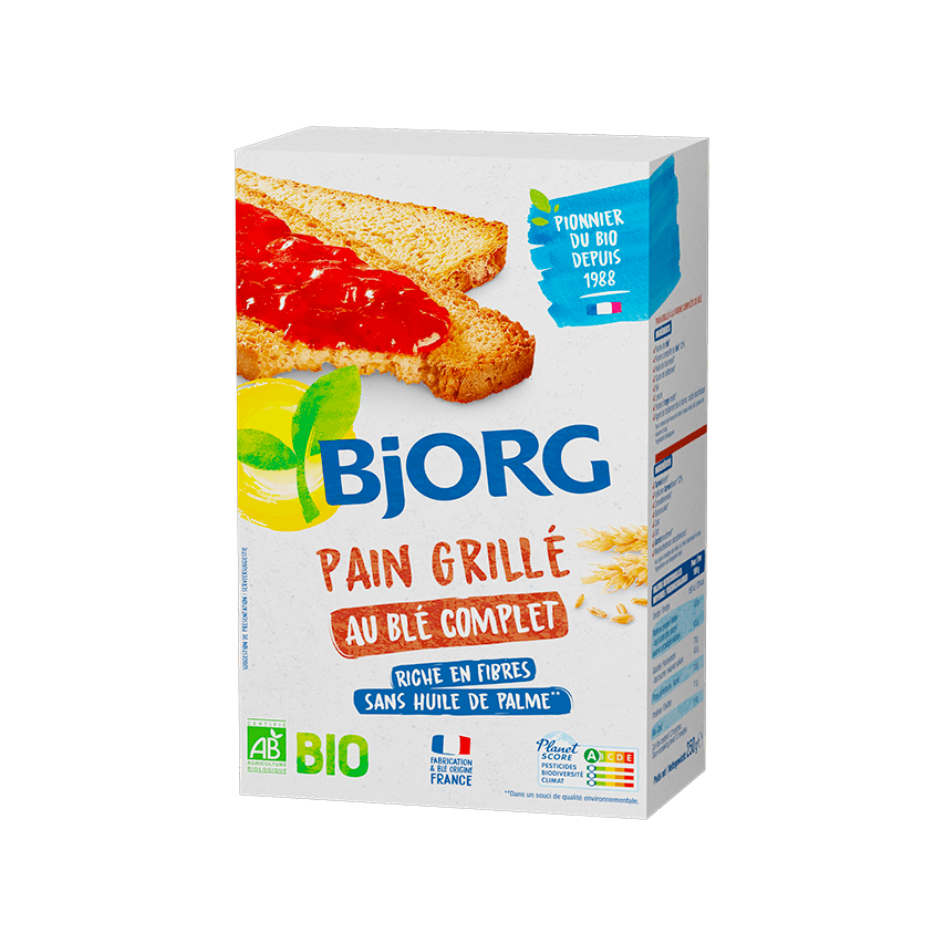 Découvrez la texture légère et croustillante des tranches de pain grillé Bjorg élaborées avec de la farine de blé complet et sans huile de palme. Les céréales complètes conservent l’enveloppe protectrice du grain. Ainsi, notre pain grillé est naturellement riche en fibres.