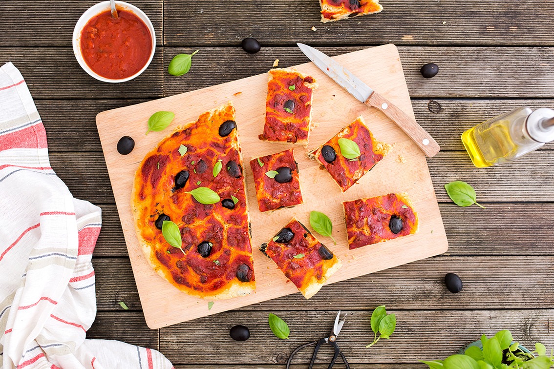 Eau, levure*, huile de coco*, olives noires* 9%, amidon de pomme de terre*, olives vertes* 4%, purée de tomates*, huile de tournesol*, vinaigre de fruits*, oignons* en poudre, sel marin, poivre blanc*, livèche*, laurier*, épaississant : farine de graines de caroube*.