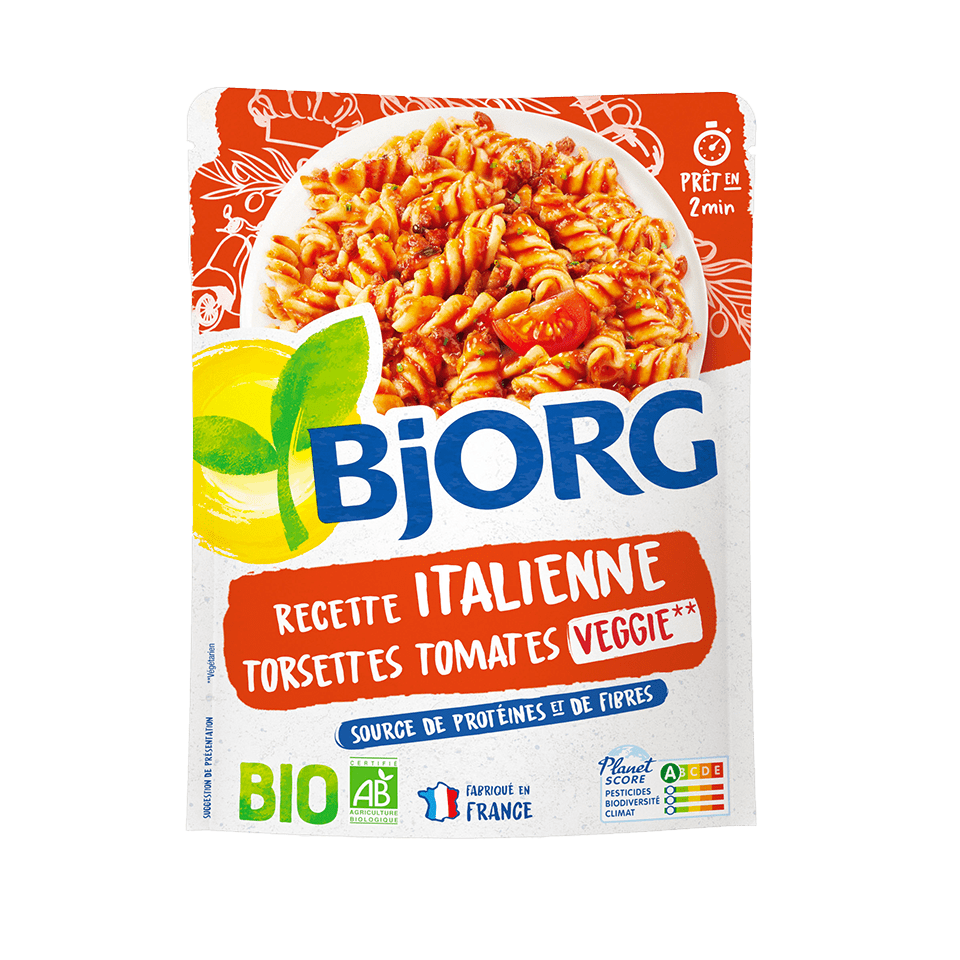 Purée de tomates* 37% (eau, double concentré de tomates*), pâtes* 23% (semoule de blé dur*, poudre de blanc d’oeuf*), pulpe de tomate* 20%, oignons* 7%, huile de tournesol*, protéines de soja texturées 2,4%, poivrons verts* 2%, sel marin, ciboulette*, jus de citron*, basilic*, ail*, épices* et herbes aromatiques*, épaississant : farine de graines de caroube*.