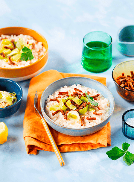 Laissez mijoter sur feu doux 5 minutes environ en continuant de remuer puis versez-y le riz et le bouillon