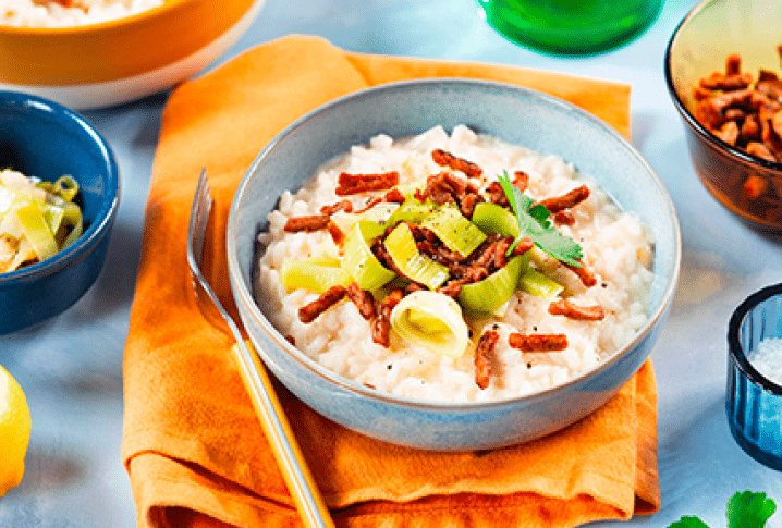 - Agrémenter de poireaux étuvés, et les allumettes veggie Bjorg, bien mélanger.