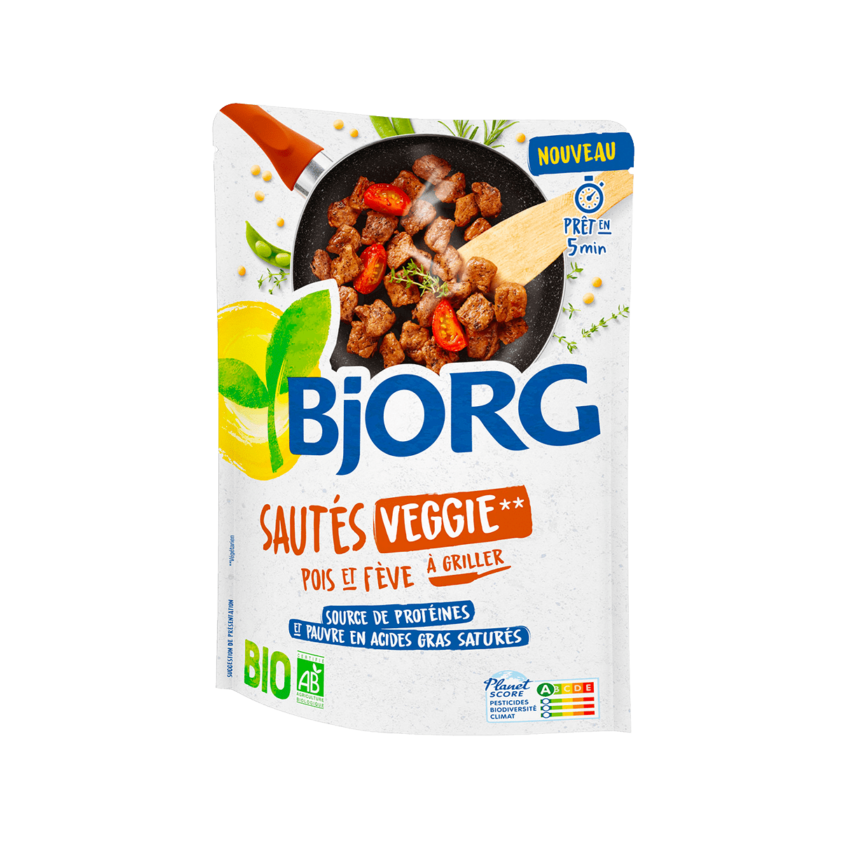 Dans un poêle faire cuire les sautés veggie «pois et fève» Bjorg avec un filet d’huile d’olive pendant une dizaine de minutes.