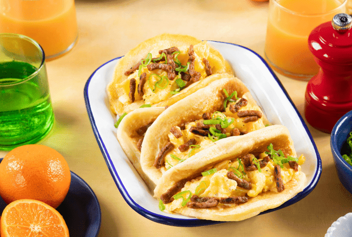 Garnir les tacos pancake d’œufs brouillés, agrémenter d’allumettes veggie et enfin d’oignon vert ciselé.