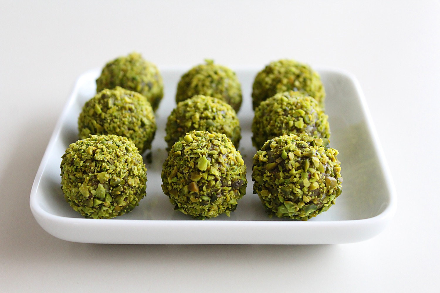 6. Façonnez en une vingtaine de petites boules d’environ 2 cm de diamètre et roulez-les dans les pistaches hachées.