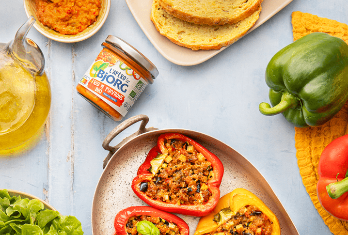 - Placez vos poivrons épépinés dans un plat à gratin, badigeonnez d’huile d’olive, puis enfournez au grill 20 minutes.